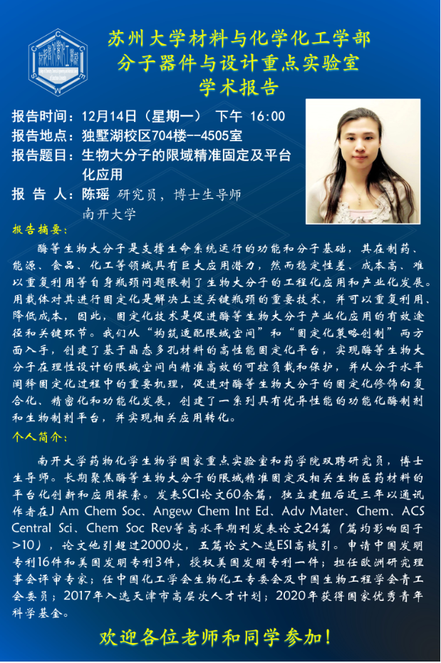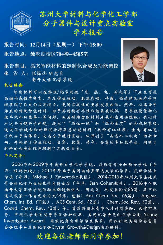 苏州大学材料与化学化工学部分子器件与设计重点实验室学术报告