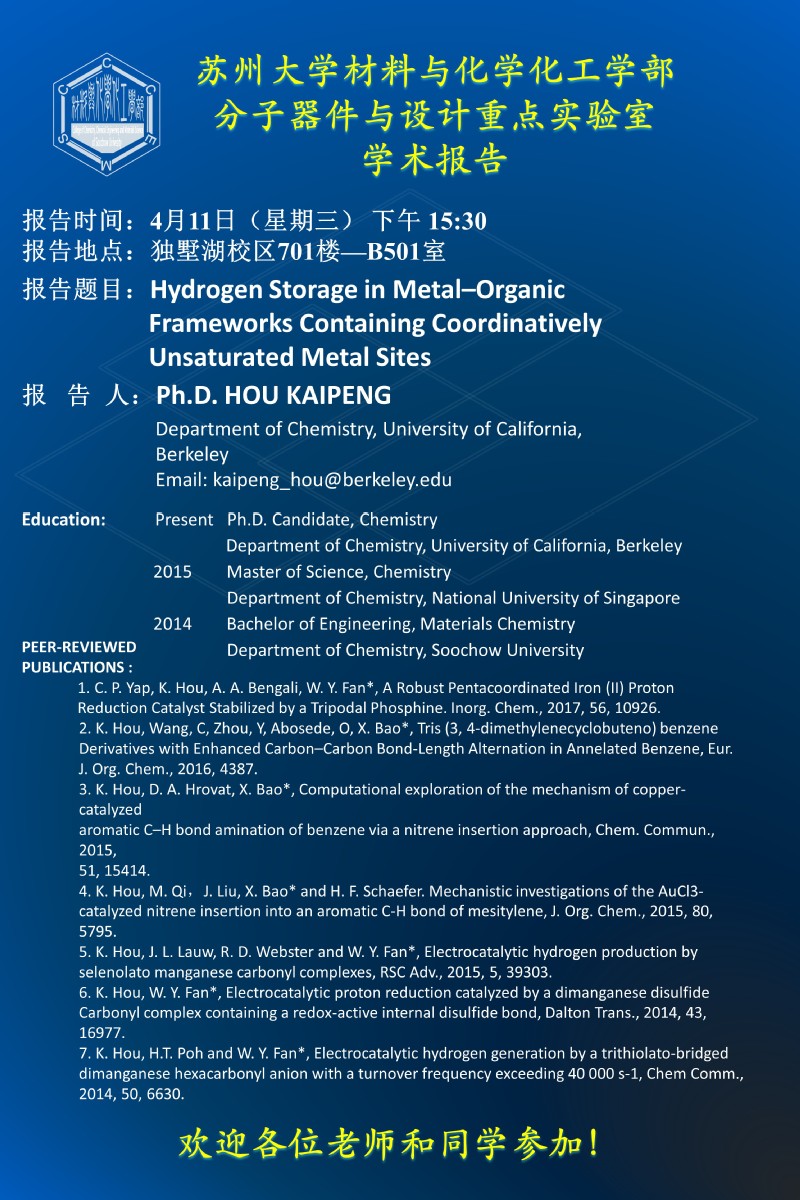 学术报告:Hydrogen Storage in Metal-Organic Frameworks Containing Coordinatively Unsaturated Metal Sites