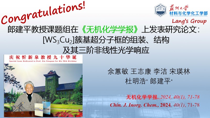 郎建平教授课题组在《无机化学学报》上发表研究论文:[WS3Cu2]簇基超分子框的组装、结构及其三阶非线性光学响应