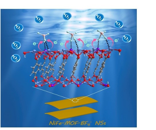 Metal–organic framework (MOF) nanosheets with attractive chemical and structural properties have been considered as prominent oxygen evolution reaction (OER) electrocatalysts, while the insufficient exposed active sites and low electrical conductivity of MOFs limit their electrocatalytic activity and further industrial applications. Herein, a unique strategy to remarkably boost electrocatalytic OER activity of one Ni-based MOF is developed by the simultaneous incorporation of Fe3+ ions and BF4– anions within its layer structure. The optimized electrocatalyst NiFe-MOF-BF4–-0.3 NSs shows superior OER activity with a required ultralow overpotential of 237 mV at 10 mA cm–2, a small Tafel slope of 41 mV dec–1, and outstanding stability in an alkaline medium. The experimental and density functional theory (DFT) calculation results verify that the interactions between metal (M) ions and BF4– anions (defined as M···F, M = Ni or Fe) in this catalyst can adjust the adsorption abilities of oxygen intermediates and lower the free energy barrier of the potential-determining step by tailoring its electronic structure, thereby remarkably boosting its OER activity. This protocol provides new insights into surface and structure engineering of 2D MOFs, leading to greatly enhanced electrocatalytic OER performance.
